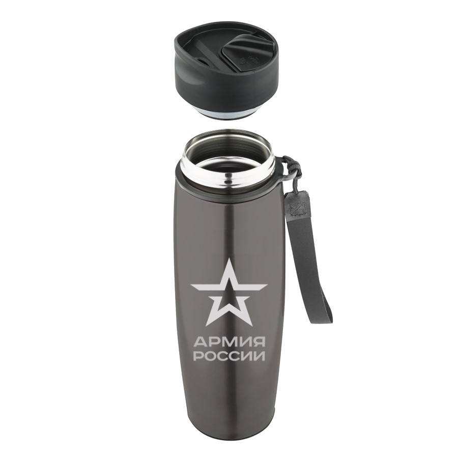 Прочная и надёжная термокружка лимитированной АРМИЯ РОССИИ выдержит любое боевое крещение и обеспечит своего владельца запасом любимого напитка. В жару и в холод содержимое термокружки сохранится нужной температуры долгое время за счёт вакуумной изоляции. Из термокружки можно пить, не снимая крышки, благодаря удобной задвижке, защищающей от расплёскивания напитка и попадания пыли внутрь. Поворотная задвижка надёжно фиксируется в положениях «open»/«close». Удобный поильник и комфортная система «открывания-закрывания» позволяет пользоваться термокружкой даже в движении, без опасения пролить содержимое. Для удобства переноски термокружка оснащена прочным тканевым ремешком, а противоскользящее покрытие дна термокружки делает её устойчивой на гладких поверхностях. Размеры мини-термоса подходят для большинства автомобильных подстаканников и велосипедных держателей. Уникальное покрытие тёмно-серого цвета отличается практичностью и создаёт привлекательный внешний вид термокружки.