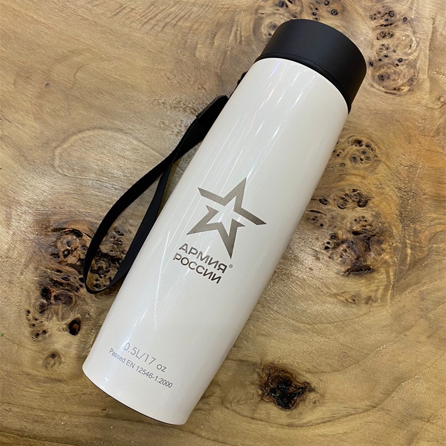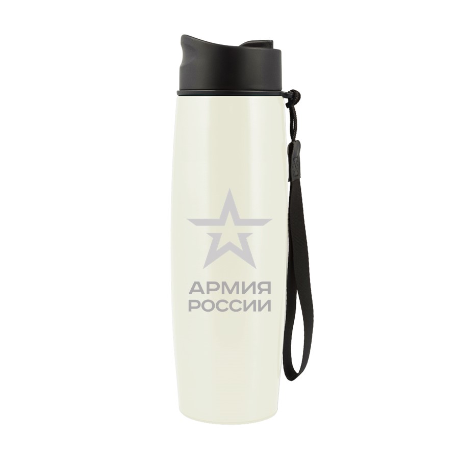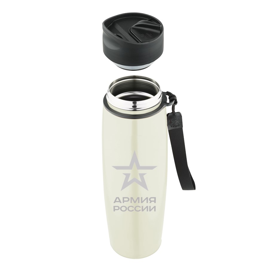 Стильная и компактная термокружка лимитированной коллекции АРМИЯ РОССИИ - оригинальное средство индивидуальной защиты от жажды в любое время года. В жару и в холод напиток сохранится в термокружке прохладным или горячим на протяжении 6-8 часов благодаря эффективной вакуумной изоляции. Корпус и колба термокружки изготовлены из высококачественной пищевой нержавеющей стали, инертной по отношению к содержимому, не влияющей на вкус и аромат напитка. Герметичность термокружки обеспечивается особой конструкцией крышки-пробки с поворотной задвижкой, защищающей также от попадания пыли внутрь. Термокружкой легко пользоваться даже во время марш-броска - за счет простого механизма «открывания-закрывания» одной рукой и удобного поильника с небольшим выливным отверстием, предотвращающим расплёскивание напитка на бегу. Эргономичная форма, противоскользящее основание и ремешок для удобства ручной переноски дополняют функциональность мини-термоса. Свой парадный внешний вид термокружка сохранит на долгие годы благодаря уникальному покрытию сливочного цвета с лёгким эффектом мерцания.